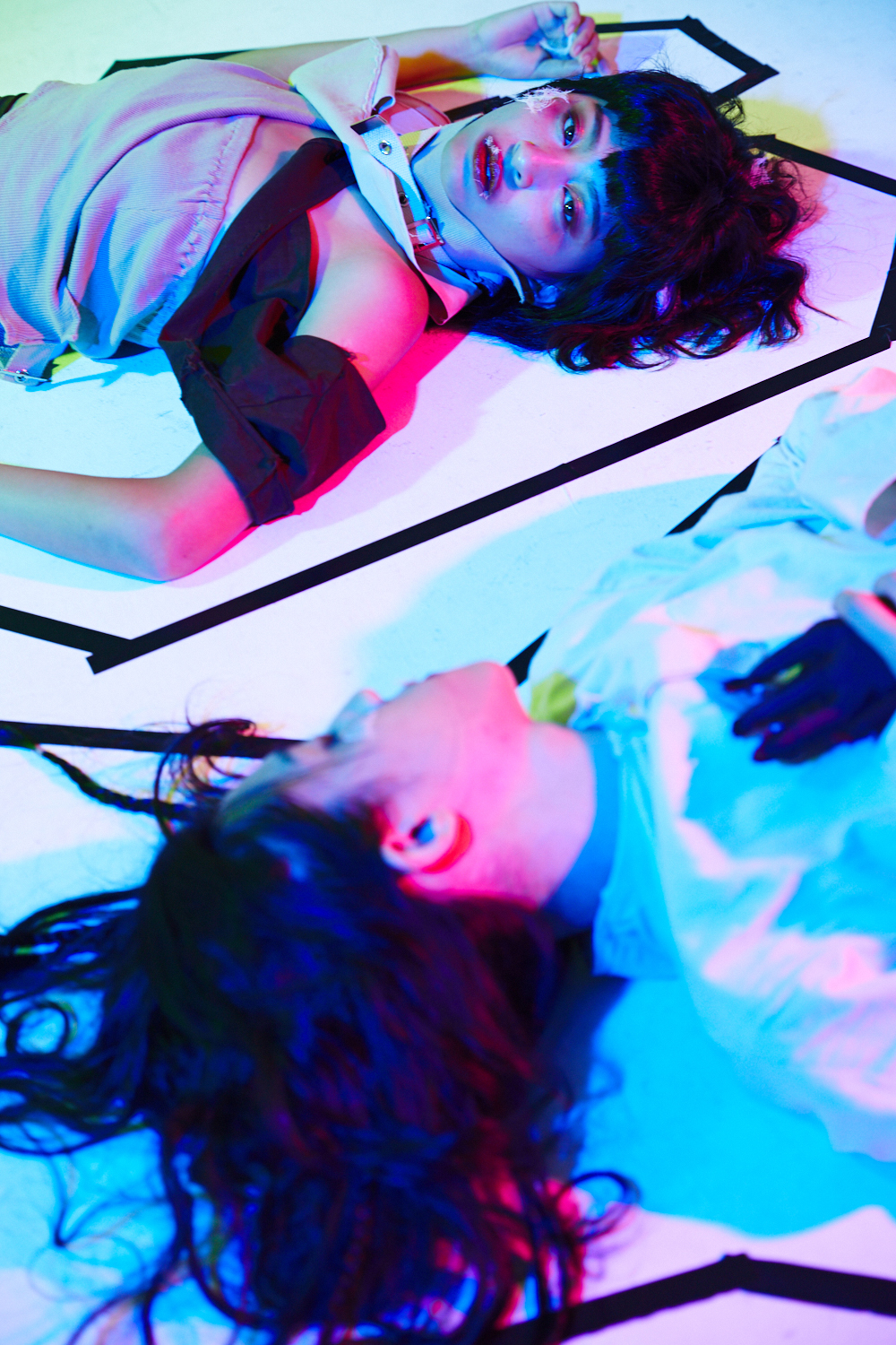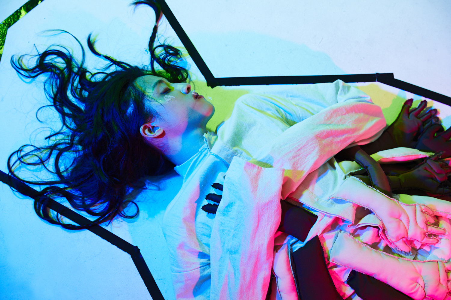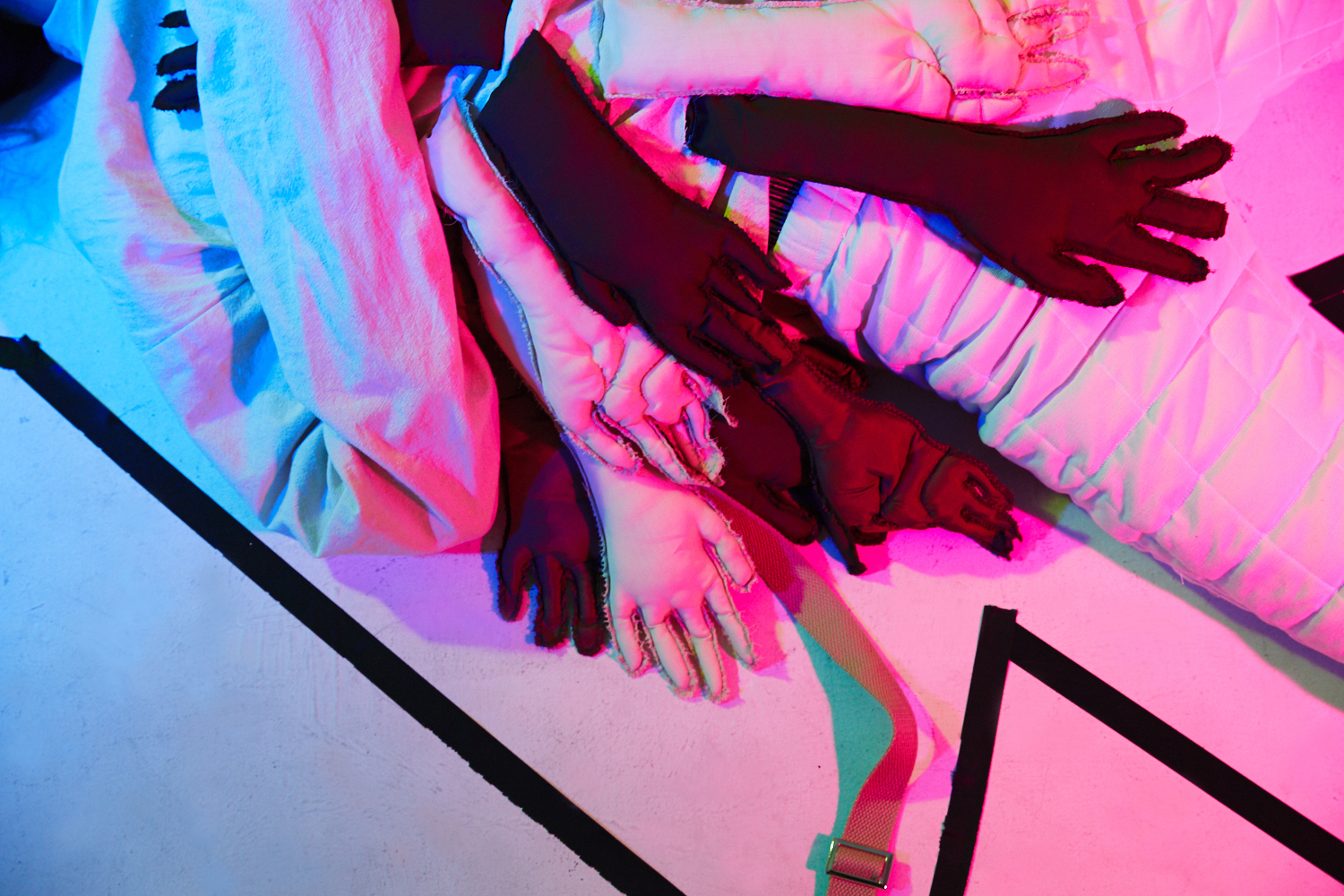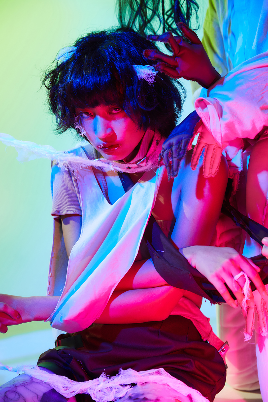 裙裝為異材質,使用矽膠材質為基底,加入廢布邊角料以及車縫線。